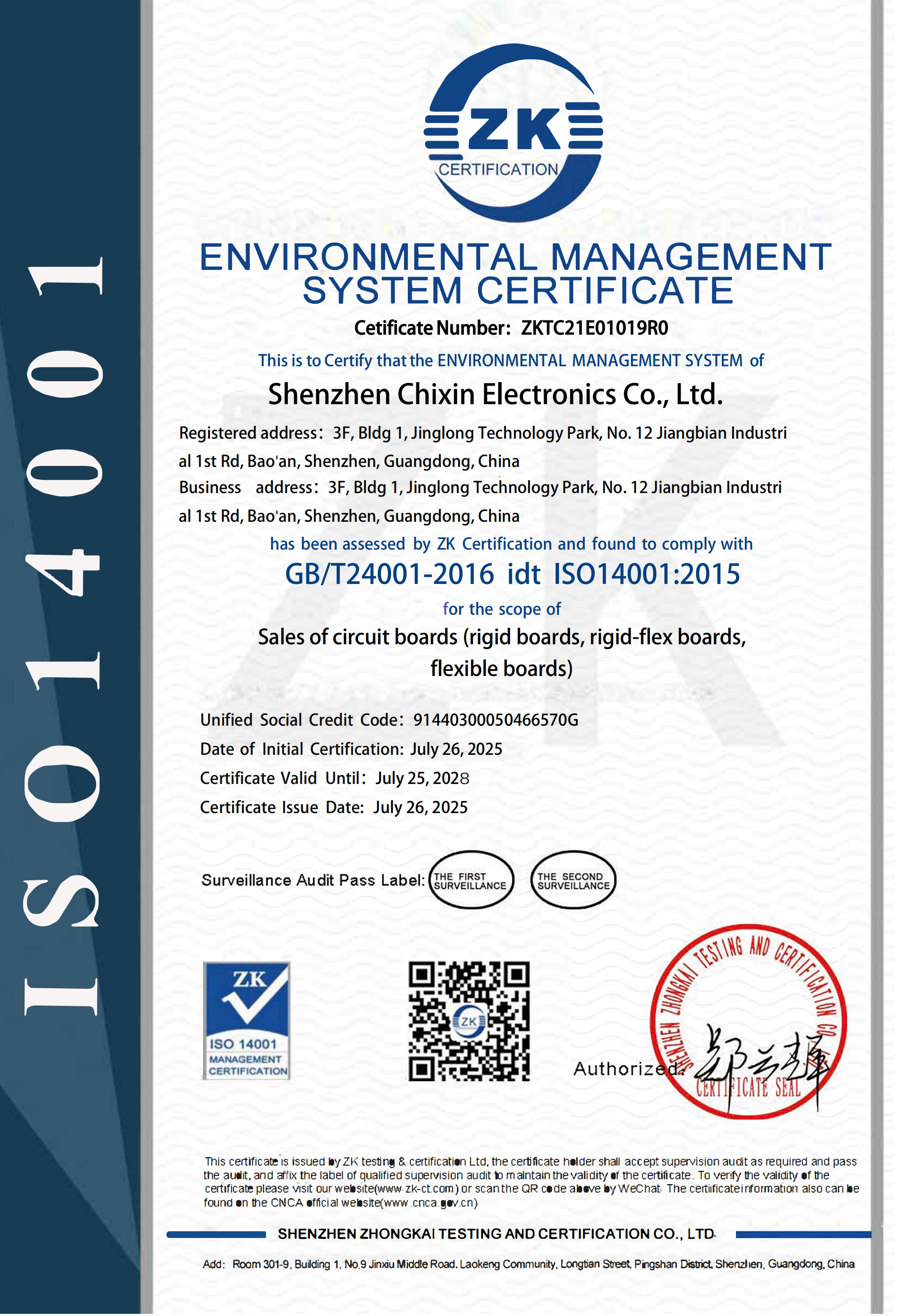 To ensure uncompromising quality management, we adhere to a modern QES management system and hold ISO 9001 quality management, ISO 14001 environmental management, and ISO 45001 occupational health and safety certifications. Our products are CE and RoHS certified for the EU market and UL certified for the United States. We vigorously promote automated flexible circuit production, equipped with a full suite of machinery including automatic material cutting machines, automatic drilling machines, automatic stiffener placement machines, high-precision UV laser cutting machines, fully automatic screen printing machines, inkjet coders, vacuum laminating presses, and vacuum packaging machines—achieving an overall automation rate of 86.8%.